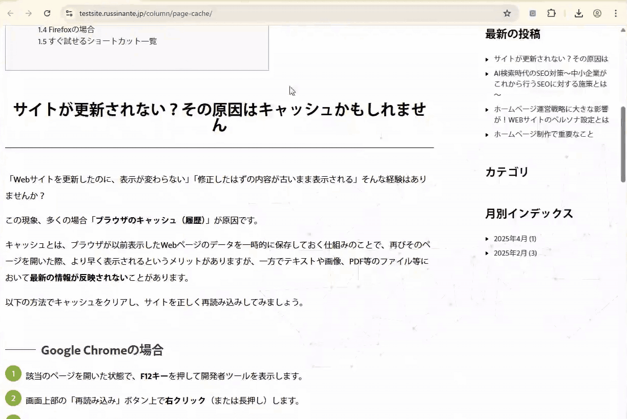 更新したはずのページが更新されないときは、まずキャッシュをクリアすることを試してみてください。表示の不具合があっさり解消するかもしれません。
