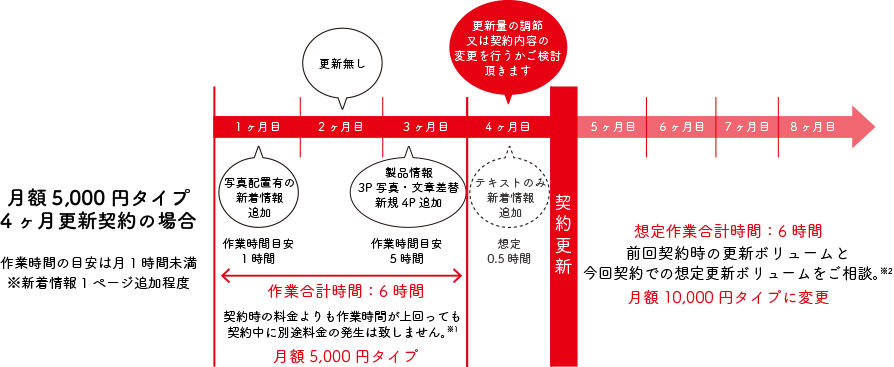 基本的な更新の場合は別途料金は発生致しませんが、契約期間中でも新たなシステムの構築・機能自体の追加や、特設ページなどの制作の場合は別途お見積りを作成させて頂く場合がございます。