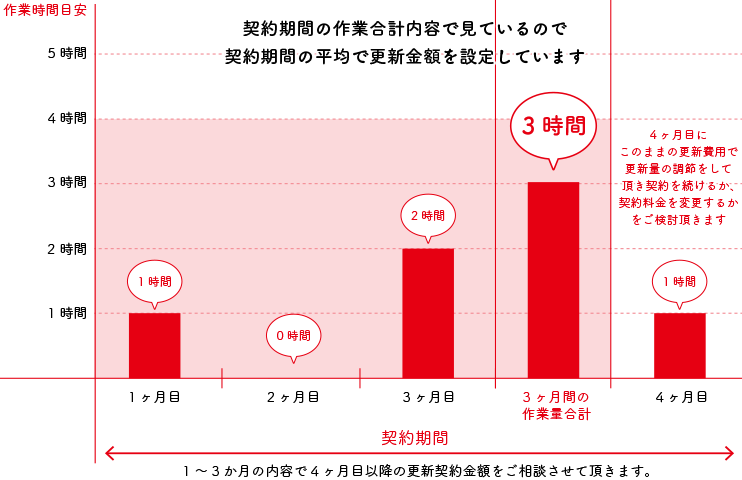 弊社は契約期間内で総合して作業ボリュームを見るため月の平均金額内であれば翌月に上乗せして大きな作業を行う事が可能です。