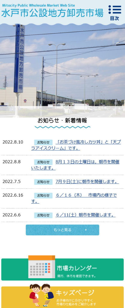 公共情報発信関連 Webデザインリニューアル HTMLコーディング CMS レスポンシブコーディング スマートフォン対応ページ https://www.mito-ichiba.com/ スマートフォン表示 スマートフォン最適化の状態で見る