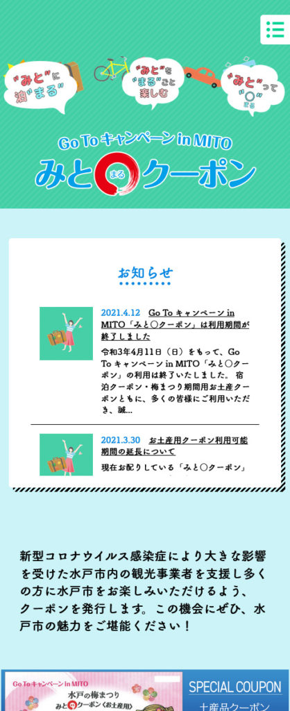みとまるクーポン様administration 公共情報発信関連 Webデザイン HTMLコーディング CMS レスポンシブコーディング スマートフォン対応ページ https://mitomaru.mitokoumon.com/ スマートフォン表示 スマートフォン最適化の状態で見る 制作実績一覧へ戻る