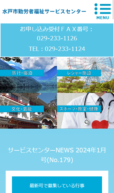 一般財団法人 水戸市勤労者福祉サービスセンター様administration 公共情報発信関連 保守管理 Webデザイン Webデザインリニューアル HTMLコーディング CMS レスポンシブコーディング スマートフォン対応ページ オリジナルウェブシステム開発 https://mito-sc.com/ スマートフォン表示 スマートフォン最適化の状態で見る 制作実績一覧へ戻る