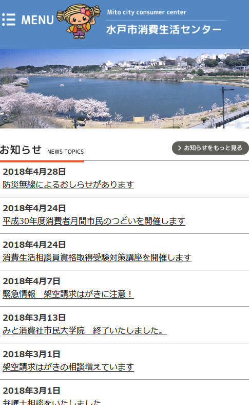 水戸市消費生活センター様administration 公共情報発信関連 水戸市様 保守管理 Webデザイン Webデザインリニューアル HTMLコーディング CMS レスポンシブコーディング http://mitosyohi.com/ スマートフォン表示 スマートフォン最適化の状態で見る 制作実績一覧へ戻る