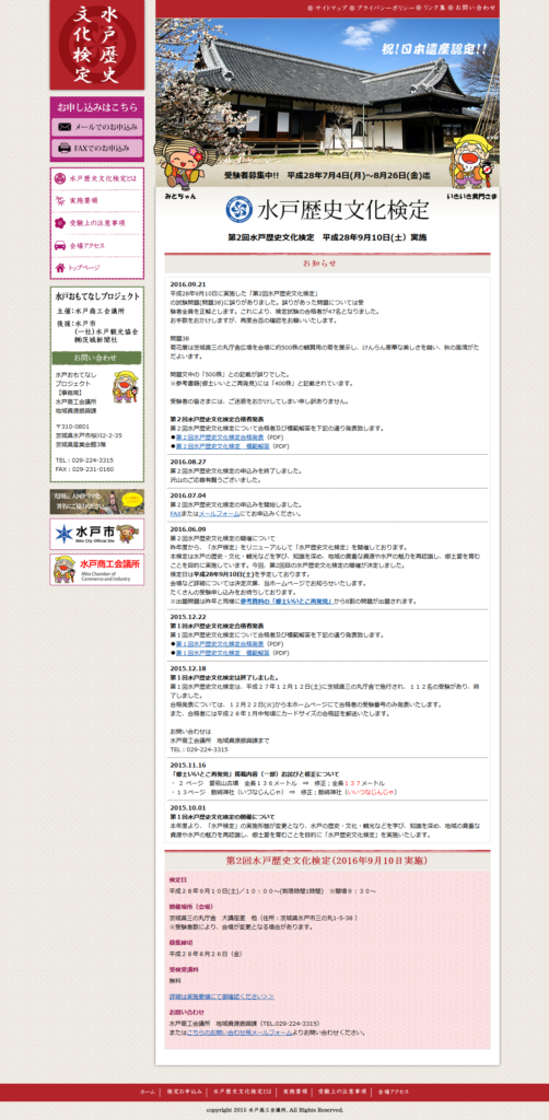 水戸歴史文化検定様administration 公共情報発信関連 水戸商工会議所様 保守管理 Webデザイン HTMLコーディング http://mito.inetcci.or.jp/mitokentei/ 制作実績一覧へ戻る