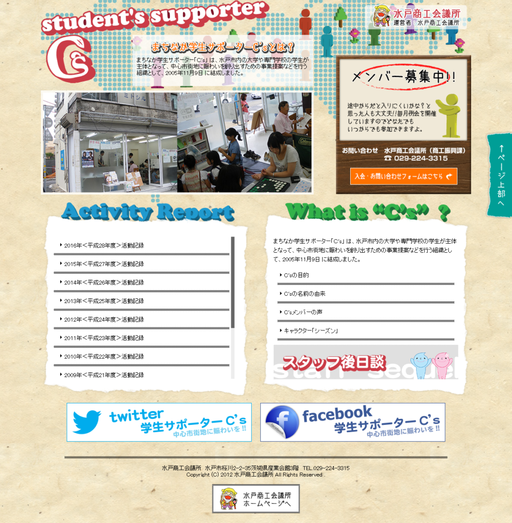 学生サポーター C’s様administration 公共情報発信関連 水戸商工会議所様 保守管理 Webデザイン Webデザインリニューアル HTMLコーディング http://tmo.e-mito.net/cs/ 制作実績一覧へ戻る