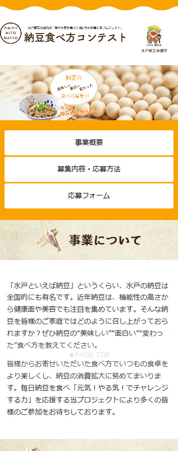 納豆食べ方コンテスト様administration 公共情報発信関連 水戸商工会議所様 保守管理 Webデザイン HTMLコーディング レスポンシブコーディング https://mito.inetcci.or.jp/nattorecipe/ スマートフォン表示 スマートフォン最適化の状態で見る 制作実績一覧へ戻る