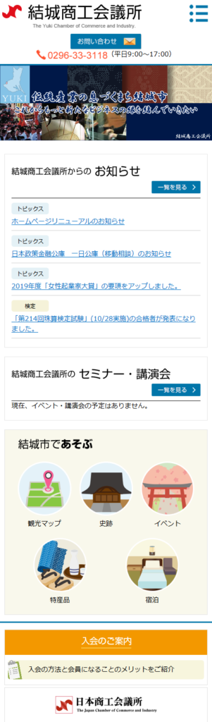 結城商工会議所様administration 公共情報発信関連 Webデザイン Webデザインリニューアル HTMLコーディング CMS レスポンシブコーディング http://yuuki.inetcci.or.jp/ スマートフォン表示 スマートフォン最適化の状態で見る 制作実績一覧へ戻る