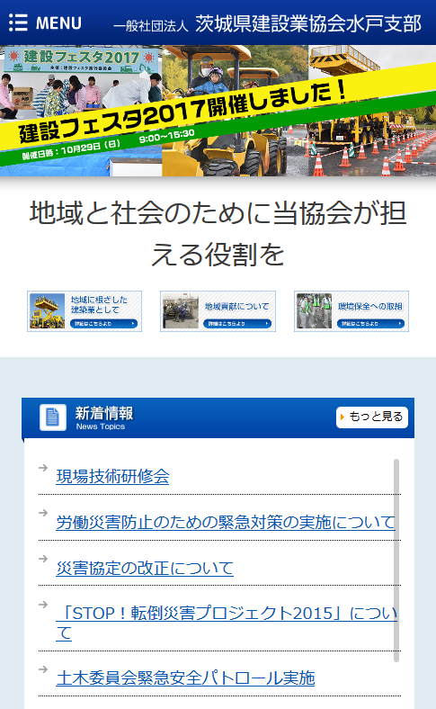 公共情報発信関連 茨城県建設業協会水戸支部 様 保守管理 Webデザイン Webデザインリニューアル HTMLコーディング CMS レスポンシブコーディング http://www.kensetsu310.com/ スマートフォン表示 スマートフォン最適化の状態で見る
