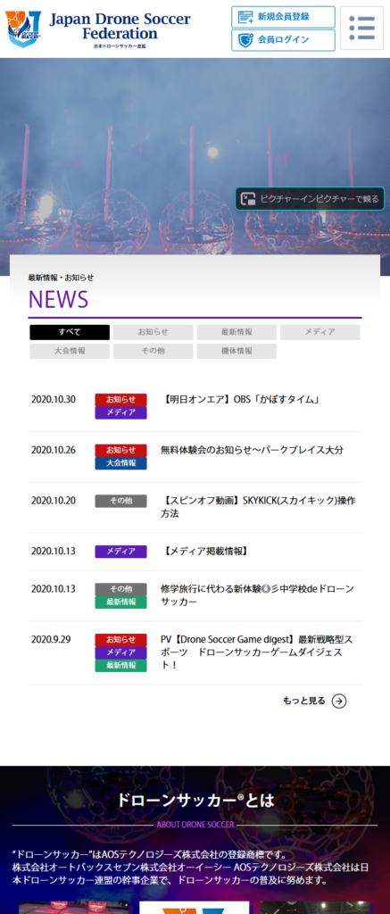 ドローンサッカー連盟様autobacs オートバックス関連 ABシステムソリューションズ様 Webデザイン HTMLコーディング CMS レスポンシブコーディング スマートフォン対応ページ https://japan-dronesoccer.com/ スマートフォン表示 スマートフォン最適化の状態で見る 制作実績一覧へ戻る