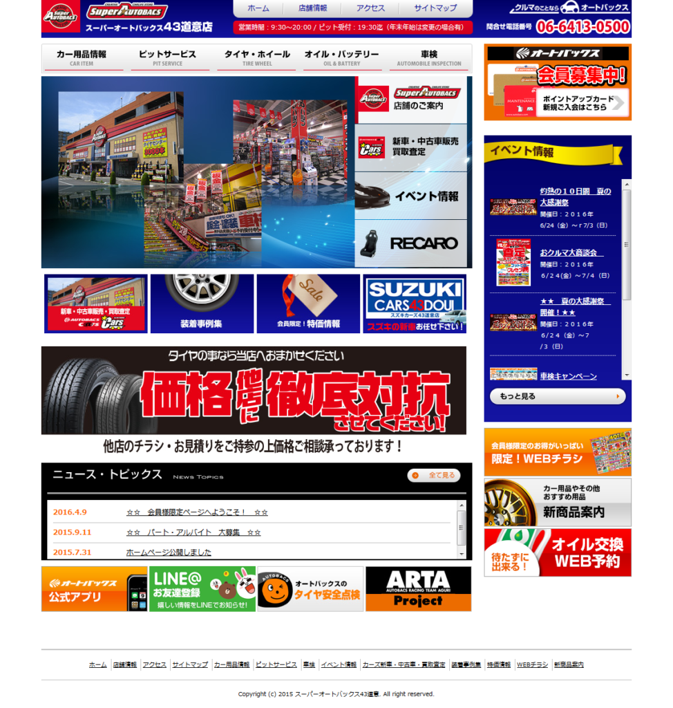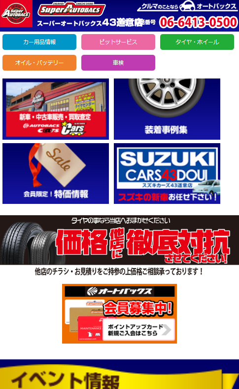 スーパーオートバックス43道意店様autobacs オートバックス関連 ABシステムソリューション様 Webデザイン HTMLコーディング CMS レスポンシブコーディング http://hokusetu-ab.com/43doui/ スマートフォン表示 スマートフォン最適化の状態で見る 制作実績一覧へ戻る