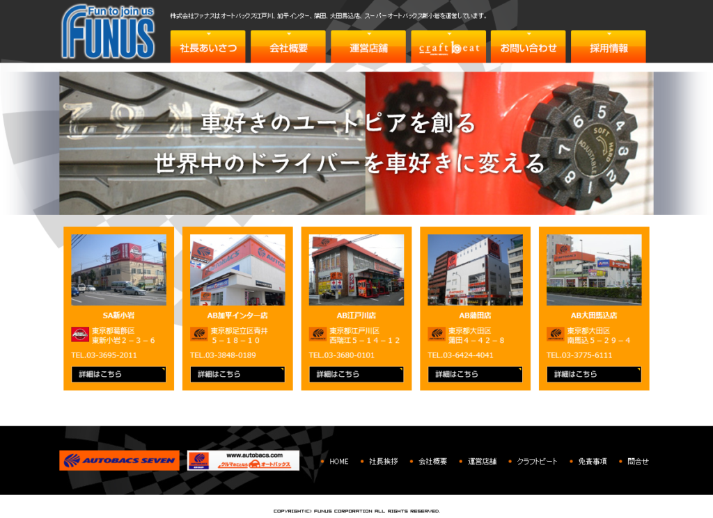 株式会社ファナス様autobacs オートバックス関連 ABシステムソリューション様 Webデザイン Webデザインリニューアル HTMLコーディング http://www.funus.co.jp/ 制作実績一覧へ戻る