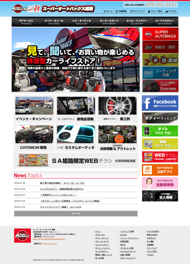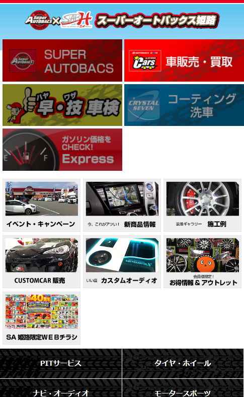 オートバックス関連 ABシステムソリューション様 保守管理 Webデザイン Webデザインリニューアル HTMLコーディング CMS レスポンシブコーディング http://www.superautobacs-himeji.com/ スマートフォン表示 スマートフォン最適化の状態で見る