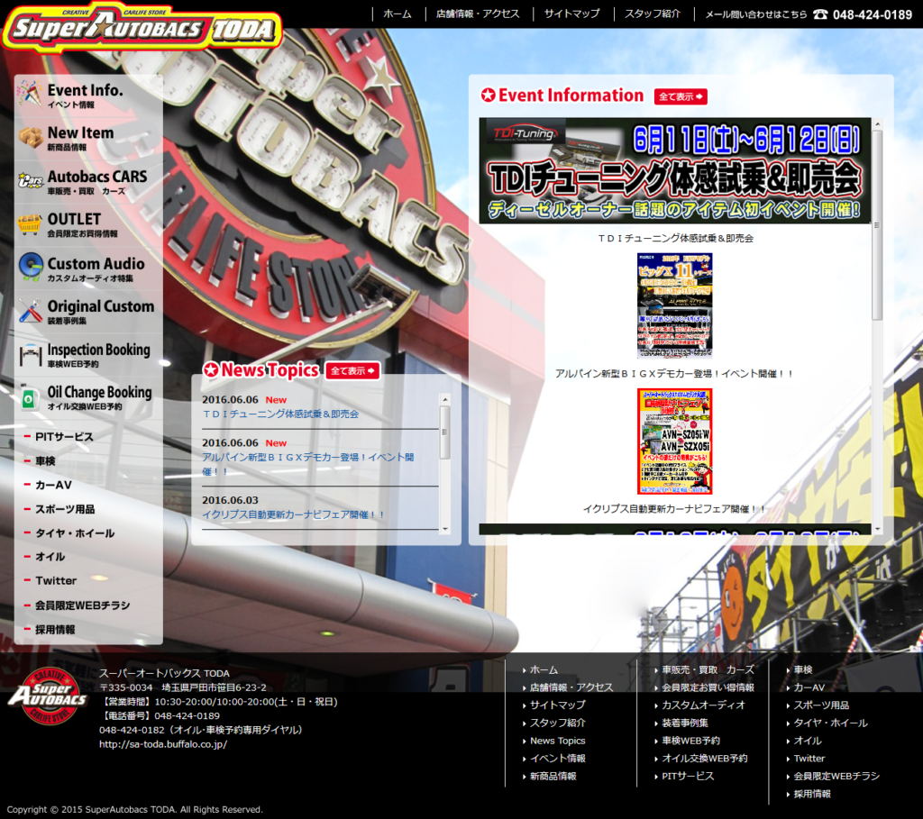 スーパーオートバックス TODA様autobacs オートバックス関連 ABシステムソリューション様 保守管理 Webデザイン Webデザインリニューアル HTMLコーディング レスポンシブコーディング オリジナルウェブシステム開発 http://shop.buffalo.co.jp/toda/ スマートフォン表示 スマートフォン最適化の状態で見る 制作実績一覧へ戻る