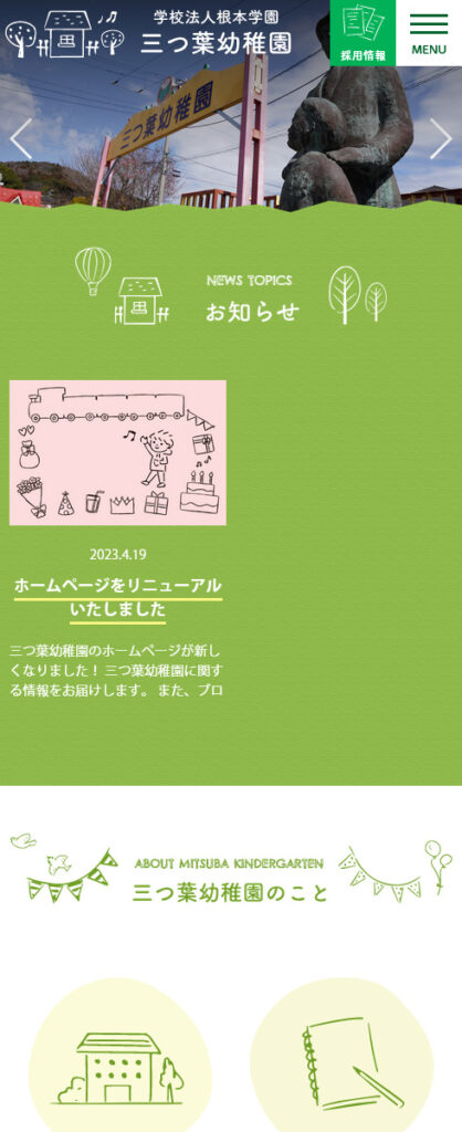 福祉施設関連 Webデザインリニューアル HTMLコーディング CMS レスポンシブコーディング スマートフォン対応ページ https://mitsuba-kinder.com/ スマートフォン表示 スマートフォン最適化の状態で見る