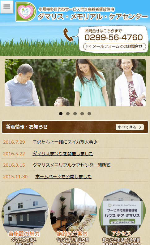 ダマリス・メモリアル・ケアセンター様care 福祉施設関連 Webデザイン HTMLコーディング CMS レスポンシブコーディング http://damaris.jp/ スマートフォン表示 スマートフォン最適化の状態で見る 制作実績一覧へ戻る