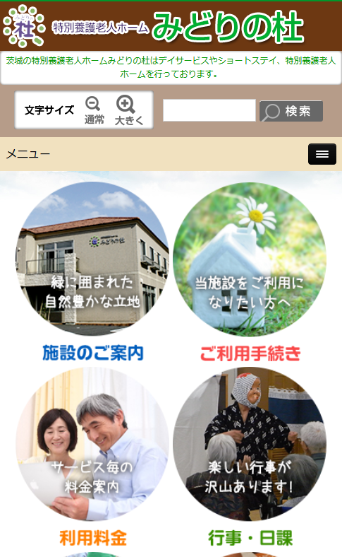 福祉施設関連 社会福祉法人つつみ会様 保守管理 Webデザイン Webデザインリニューアル HTMLコーディング CMS レスポンシブコーディング http://tsutsumikai.com/midori/ スマートフォン表示 スマートフォン最適化の状態で見る