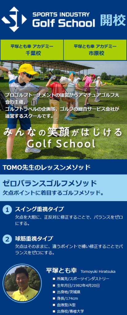 スポーツインダストリー Golf School様etc その他 Webデザイン HTMLコーディング レスポンシブコーディング スマートフォン対応ページ https://si-golfschool.com/ スマートフォン表示 スマートフォン最適化の状態で見る 制作実績一覧へ戻る