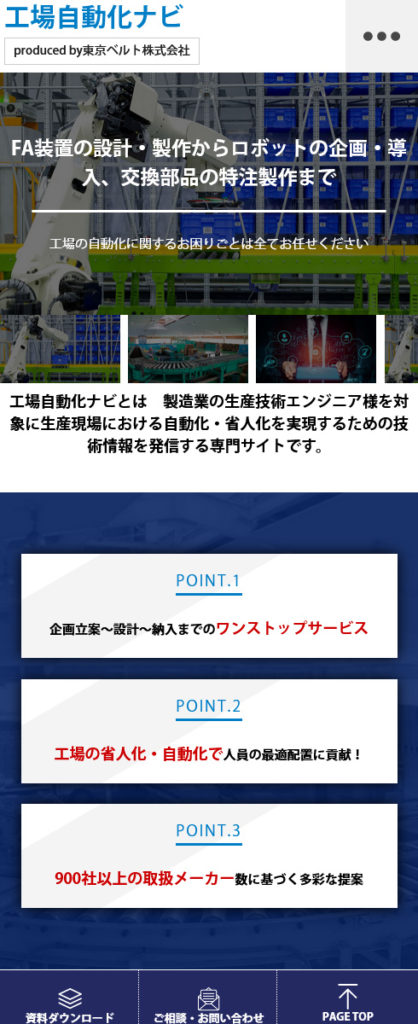 工場自動化ナビ様etc その他 東京ベルト株式会社様 Webデザイン HTMLコーディング CMS レスポンシブコーディング スマートフォン対応ページ https://fanavi-tokyo.com/ スマートフォン表示 スマートフォン最適化の状態で見る 制作実績一覧へ戻る