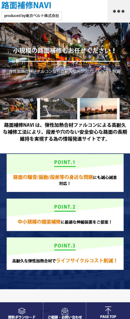 路面補修NAVI様etc その他 東京ベルト株式会社様 Webデザイン HTMLコーディング CMS レスポンシブコーディング スマートフォン対応ページ https://roadbridge-tokyo.com/ スマートフォン表示 スマートフォン最適化の状態で見る 制作実績一覧へ戻る