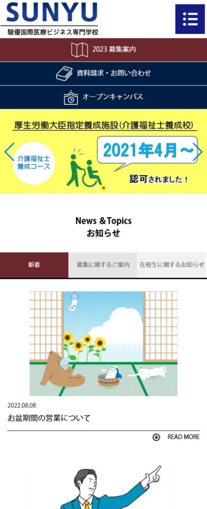 学校法人 駿優国際学園 駿優国際医療ビジネス専門学校様etc その他 Webデザインリニューアル HTMLコーディング CMS レスポンシブコーディング スマートフォン対応ページ https://sunyukokusai.ac.jp/ スマートフォン表示 スマートフォン最適化の状態で見る 制作実績一覧へ戻る