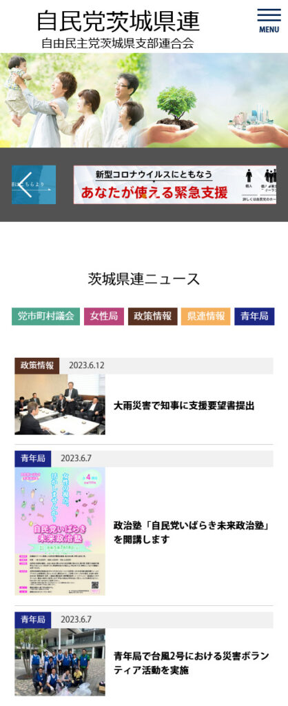 その他 Webデザインリニューアル HTMLコーディング CMS レスポンシブコーディング スマートフォン対応ページ https://www.ibaraki-jimin.jp/ スマートフォン表示 スマートフォン最適化の状態で見る