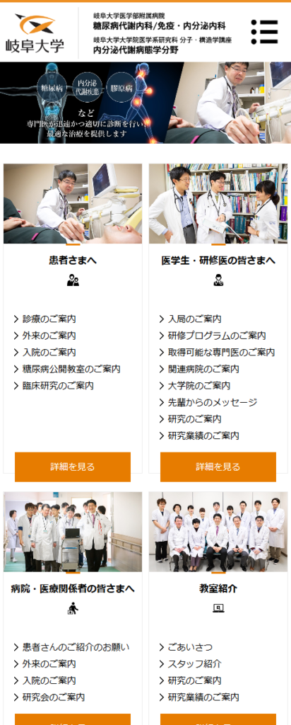 医療・病院関連 保守管理 Webデザインリニューアル HTMLコーディング レスポンシブコーディング スマートフォン対応ページ http://www.med.gifu-u.ac.jp/diabetes/ スマートフォン表示 スマートフォン最適化の状態で見る