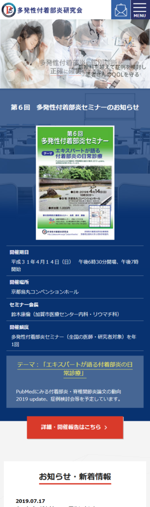 医療・病院関連 Webデザインリニューアル HTMLコーディング レスポンシブコーディング スマートフォン対応ページ http://plaza.umin.ac.jp/~polyenthesitis/ スマートフォン表示 スマートフォン最適化の状態で見る