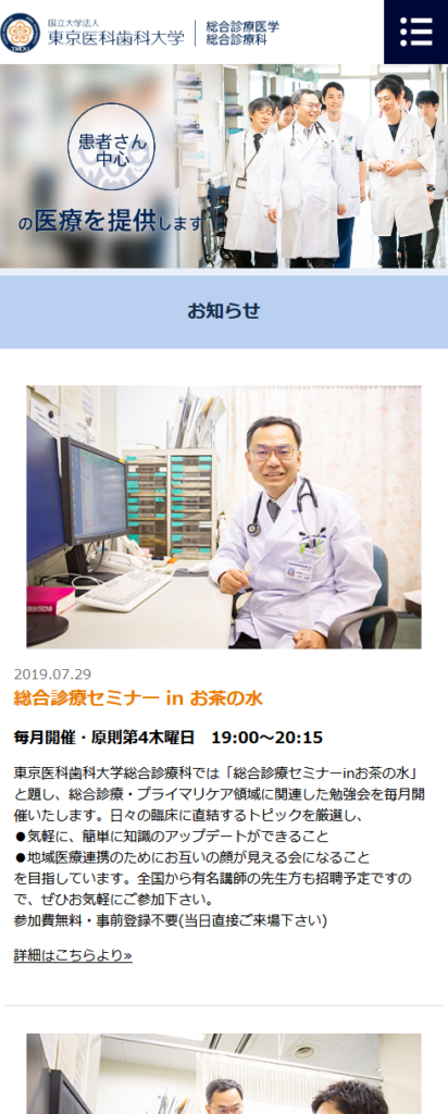 東京医科歯科大学 医学部附属病院 総合診療医学 総合診療科様medical 医療・病院関連 保守管理 Webデザインリニューアル HTMLコーディング レスポンシブコーディング スマートフォン対応ページ http://www.tmd.ac.jp/grad/fmed/ スマートフォン表示 スマートフォン最適化の状態で見る 制作実績一覧へ戻る