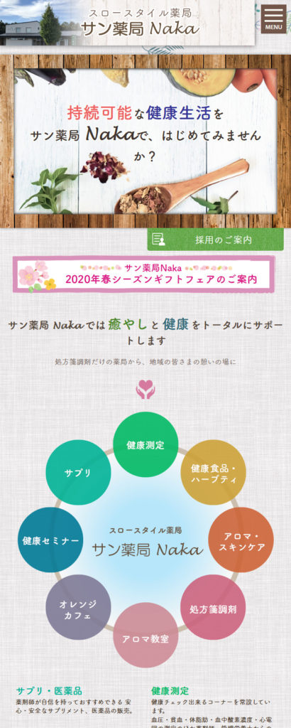 医療・病院関連 Webデザインリニューアル HTMLコーディング レスポンシブコーディング スマートフォン対応ページ https://pharmacy-sun.com/naka/ スマートフォン表示 スマートフォン最適化の状態で見る