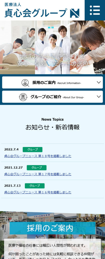 医療法人貞心会グループ様medical 医療・病院関連 Webデザインリニューアル HTMLコーディング CMS レスポンシブコーディング スマートフォン対応ページ https://www.teishinkai.or.jp/ スマートフォン表示 スマートフォン最適化の状態で見る 制作実績一覧へ戻る