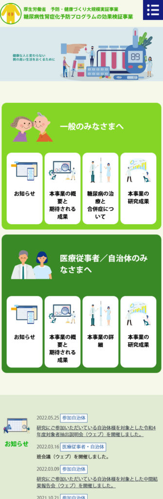 糖尿病性腎症化予防プログラムの効果検証事業様medical 医療・病院関連 Webデザイン HTMLコーディング レスポンシブコーディング スマートフォン対応ページ http://www.med.gifu-u.ac.jp/diabetes/ppdn/ スマートフォン表示 スマートフォン最適化の状態で見る 制作実績一覧へ戻る