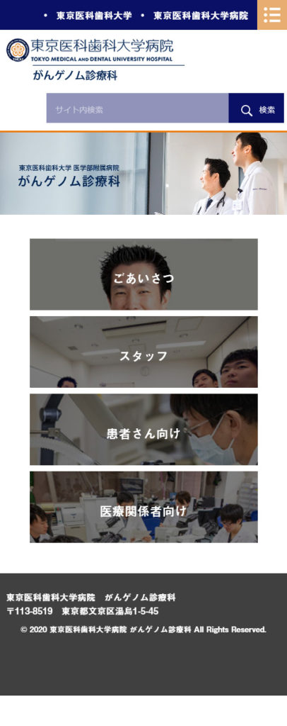 医療・病院関連 Webデザインリニューアル HTMLコーディング レスポンシブコーディング スマートフォン対応ページ https://www.tmd.ac.jp/med/canc/genome/ スマートフォン表示 スマートフォン最適化の状態で見る