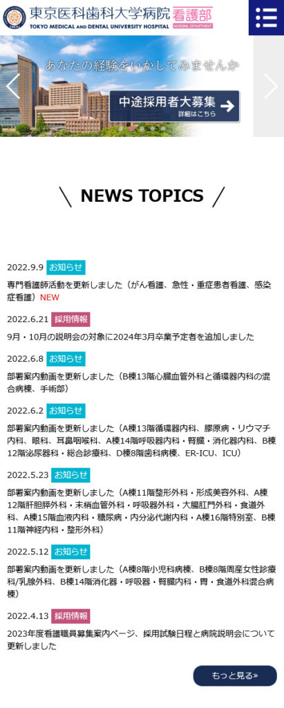 東京医科歯科大学病院 看護部様medical 医療・病院関連 Webデザインリニューアル HTMLコーディング レスポンシブコーディング スマートフォン対応ページ https://tmd-kango.com/ スマートフォン表示 スマートフォン最適化の状態で見る 制作実績一覧へ戻る