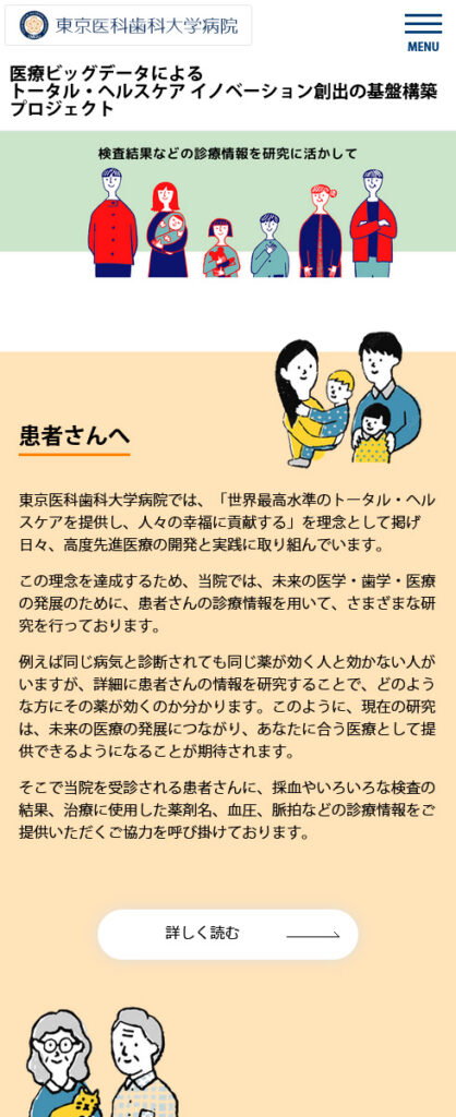 医療・病院関連 Webデザインリニューアル HTMLコーディング レスポンシブコーディング スマートフォン対応ページ https://www.tmd.ac.jp/mdp/ スマートフォン表示 スマートフォン最適化の状態で見る