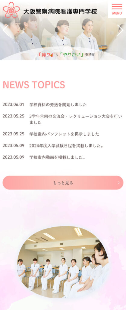 大阪警察病院看護専門学校様medical 医療・病院関連 Webデザインリニューアル HTMLコーディング CMS レスポンシブコーディング スマートフォン対応ページ https://osakakeibyo-kango.jp/ スマートフォン表示 スマートフォン最適化の状態で見る 制作実績一覧へ戻る