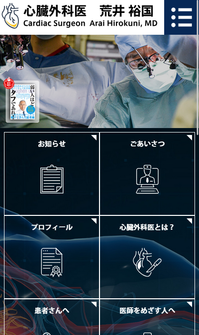 東京医科歯科大学 心臓外科医 荒井 裕国様medical 医療・病院関連 Webデザイン HTMLコーディング レスポンシブコーディング スマートフォン対応ページ https://araihirokuni.com/ スマートフォン表示 スマートフォン最適化の状態で見る 制作実績一覧へ戻る