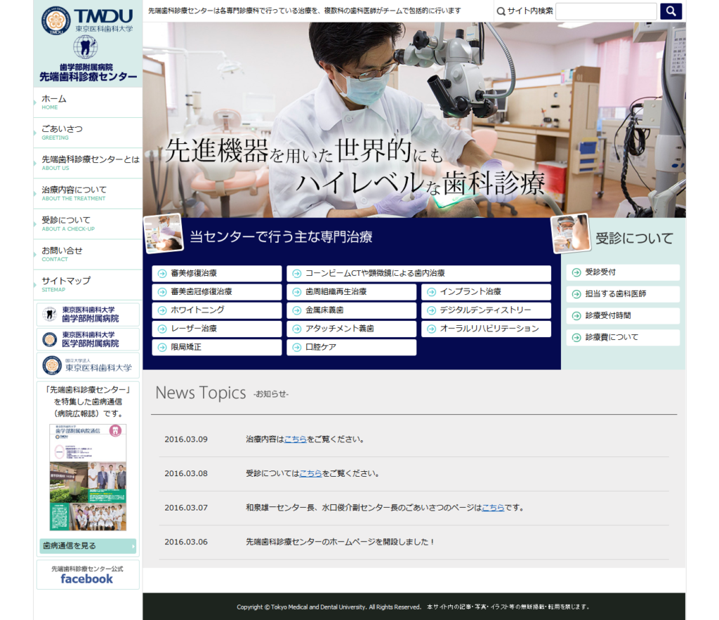 東京医科歯科大学歯学部附属病院 先端歯科診療センター様medical 医療・病院関連 保守管理 Webデザイン HTMLコーディング http://www.tmd.ac.jp/denthospital/sentan/ 制作実績一覧へ戻る