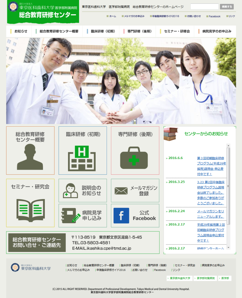 東京医科歯科大学 医学部附属病院総合教育研修センター様medical 医療・病院関連 保守管理 Webデザイン Webデザインリニューアル HTMLコーディング CMS レスポンシブコーディング http://www.tmd.ac.jp/med/cpe/ スマートフォン表示 スマートフォン最適化の状態で見る 制作実績一覧へ戻る