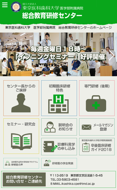 医療・病院関連 保守管理 Webデザイン Webデザインリニューアル HTMLコーディング CMS レスポンシブコーディング http://www.tmd.ac.jp/med/cpe/ スマートフォン表示 スマートフォン最適化の状態で見る