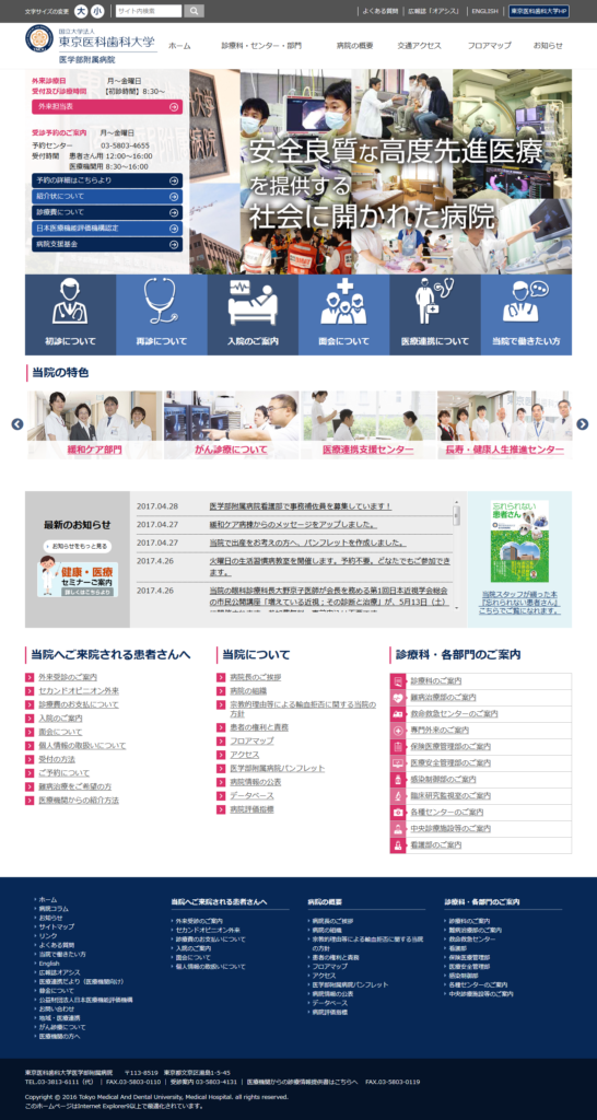 東京医科歯科大学医学部附属病院様medical 医療・病院関連 保守管理 Webデザイン Webデザインリニューアル HTMLコーディング レスポンシブコーディング http://www.tmd.ac.jp/medhospital/ スマートフォン表示 スマートフォン最適化の状態で見る 制作実績一覧へ戻る