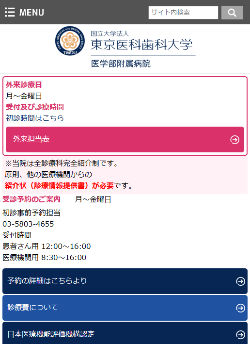 医療・病院関連 保守管理 Webデザイン Webデザインリニューアル HTMLコーディング レスポンシブコーディング http://www.tmd.ac.jp/medhospital/ スマートフォン表示 スマートフォン最適化の状態で見る