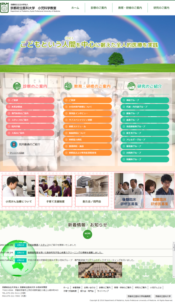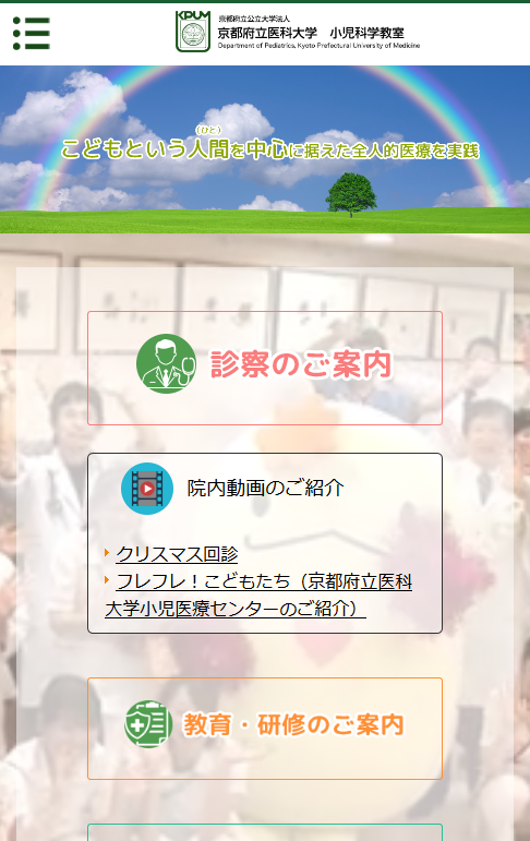 医療・病院関連 京都府立医科大学様 保守管理 Webデザイン Webデザインリニューアル HTMLコーディング レスポンシブコーディング http://www.f.kpu-m.ac.jp/k/ped/ スマートフォン表示 スマートフォン最適化の状態で見る