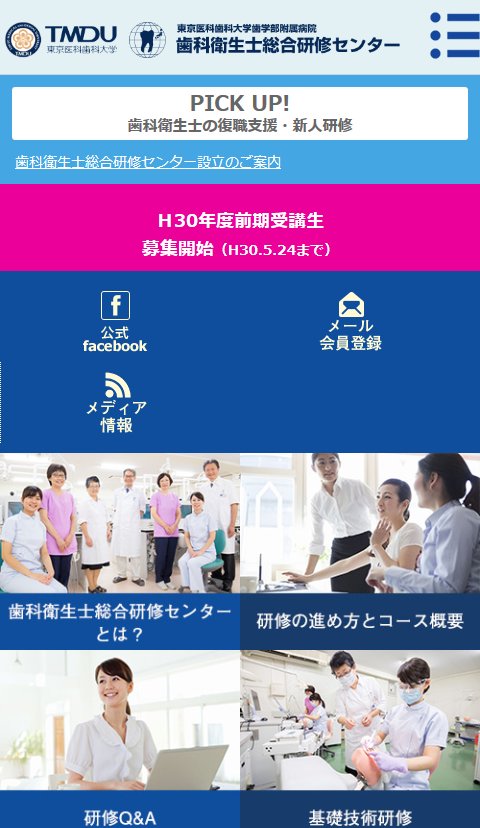 東京医科歯科大学歯学部附属病院 歯科衛生士総合研修センター様medical 医療・病院関連 保守管理 Webデザイン HTMLコーディング レスポンシブコーディング http://www.ikashikaeiseisi.com/ スマートフォン表示 スマートフォン最適化の状態で見る 制作実績一覧へ戻る
