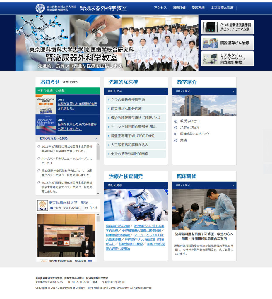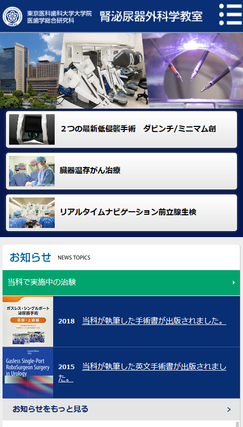 東京医科歯科大学 腎泌尿器外科学教室様medical 医療・病院関連 東京医科歯科大学様 保守管理 Webデザイン Webデザインリニューアル HTMLコーディング レスポンシブコーディング http://www.tmdu.tokyo/ スマートフォン表示 スマートフォン最適化の状態で見る 制作実績一覧へ戻る