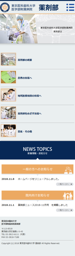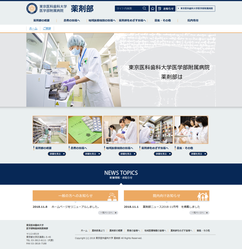 東京医科歯科大学 薬剤部様medical 医療・病院関連 保守管理 Webデザイン Webデザインリニューアル HTMLコーディング レスポンシブコーディング http://www.tmd.ac.jp/medhospital/medicine/ スマートフォン表示 スマートフォン最適化の状態で見る 制作実績一覧へ戻る