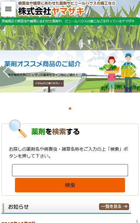 販売・商品紹介関連 保守管理 Webデザイン HTMLコーディング CMS レスポンシブコーディング http://yamazaki-agri.com/ スマートフォン表示 スマートフォン最適化の状態で見る