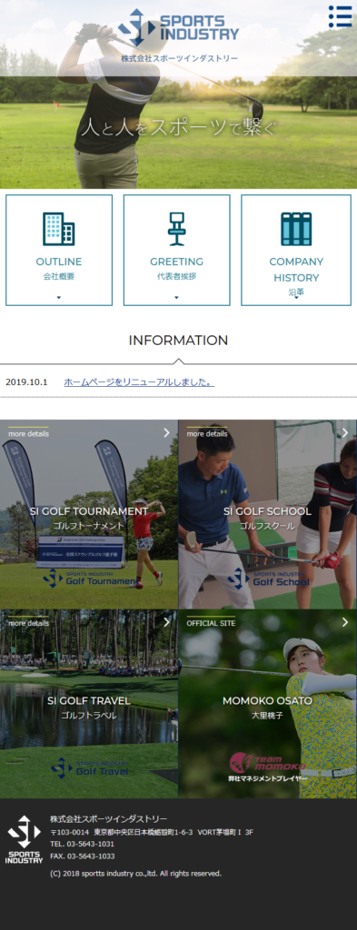 サービス業関連 スポーツインダストリー様 Webデザイン Webデザインリニューアル HTMLコーディング レスポンシブコーディング スマートフォン対応ページ https://sports-industry.jp/ スマートフォン表示 スマートフォン最適化の状態で見る