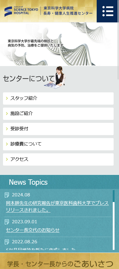 WORKS 制作実績 HOME 制作実績 東京科学大学 医学部附属病院 長寿・健康人生推進センター 東京科学大学 医学部附属病院 長寿・健康人生推進センター クライアント 東京科学大学 医学部附属病院 長寿・健康人生推進センター URL http://www.tmd.ac.jp/medhospital/chouju/ サイトタイプ 医療系サイト 作業内容 design cording responcive 一覧へ戻る 関連実績 東京科学大学 学長・内科医 田中 雄二郎 医療系サイト 第94回日本糖尿病学会中部地方会 医療系サイト 聖マリアンナ医科大学 呼吸器内科 医療系サイト CONTACT ホームページ制作に関するお悩みがある方はお気軽にご相談ください。 あああああああああああああああああああああああああああああああああああああああああああああ お問い合わせ ご相談やお見積もりご希望の方向けに、メールでのお問い合わせも承っております。こちらのフォームからお問い合わせください。